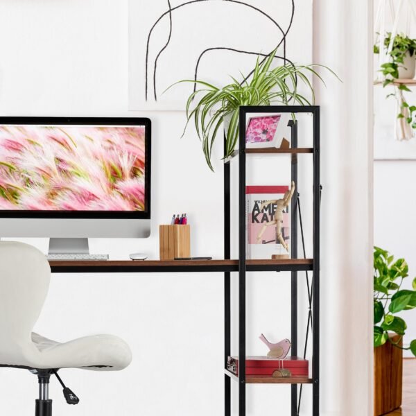The compact PC desk is the perfect combination of table and shelf. The four open compartments allow you to store folders, books as well as writing and office utensils within easy reach. The large work surface offers enough space for drawing, writing and working on a laptop or PC. Whether at home in the living room, teenager’s room, study or in the office – young people and adults have found the perfect workstation in a modern design with this computer table. There is also enough ground clearance under the home office table, for example for a mobile container.