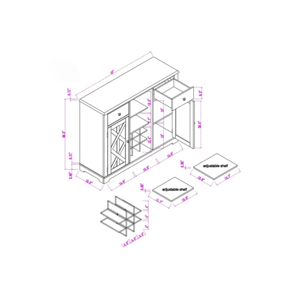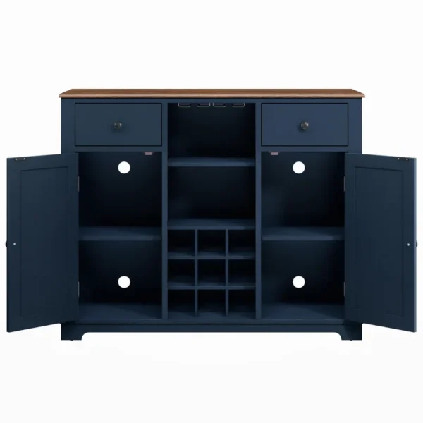 Keep your wine stored in an organized way with this wine cabinet. A built-in wine rack lets you store up to nine bottles of your favorite wines, two side doors open to reveal shelved storage for plates, serve ware, and handles of your preferred spirits, while one open lower shelf is great for showing off display plates or mugs. The center upper console features two drawers for keeping small accessories like a fork, spoon and etc. Golden round knobs allow easy access to the drawer and cabinet.
